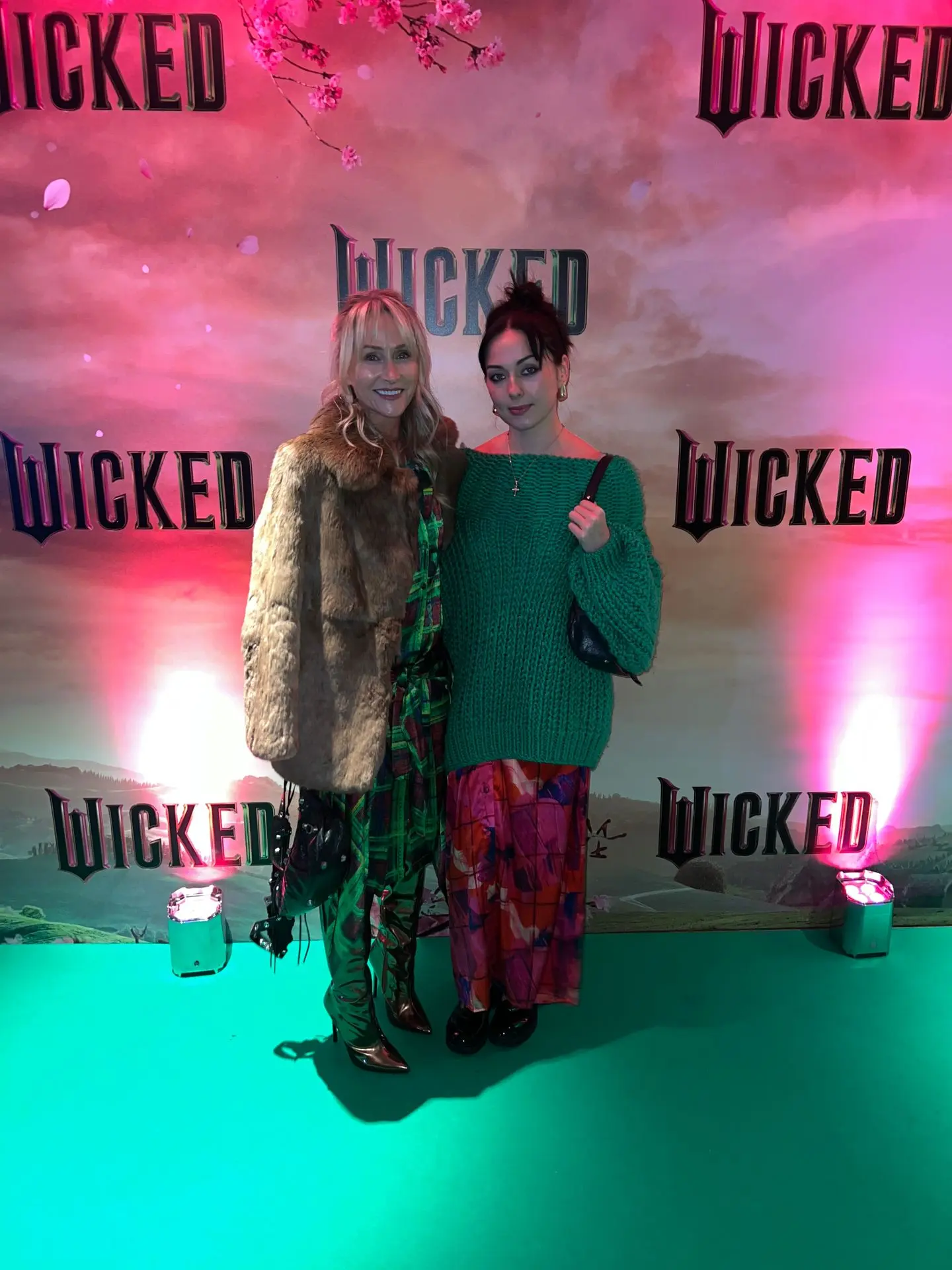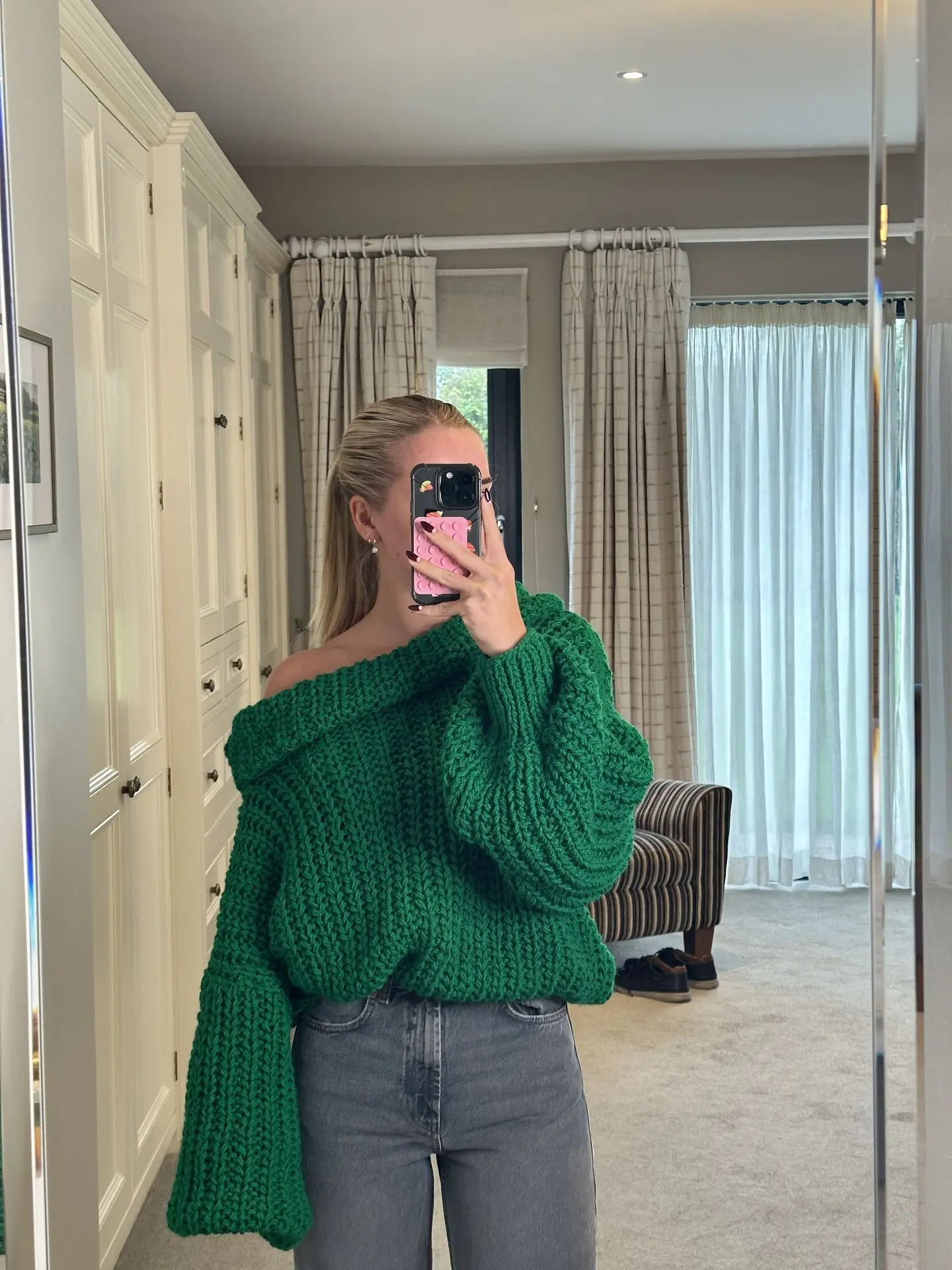 Wearing our premium wool blend Emerald Isle hand-knit jumper, made in Ireland, off the shoulder and effortlessly chic at the Wicked Premier with Helen Steele.